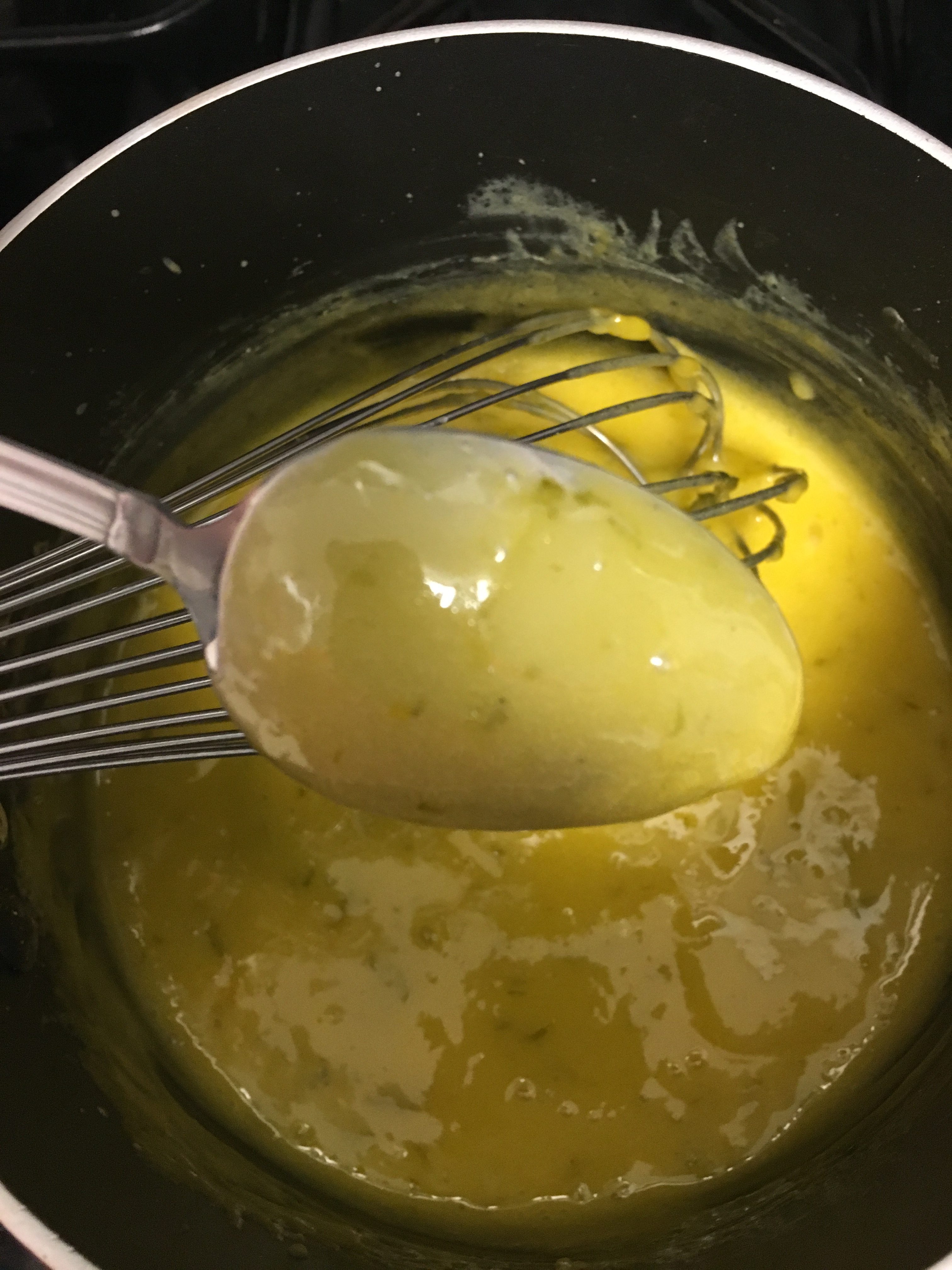 - Place the saucepan over medium-low heat and whisk in the lime juice, mint sprig, and zest.
