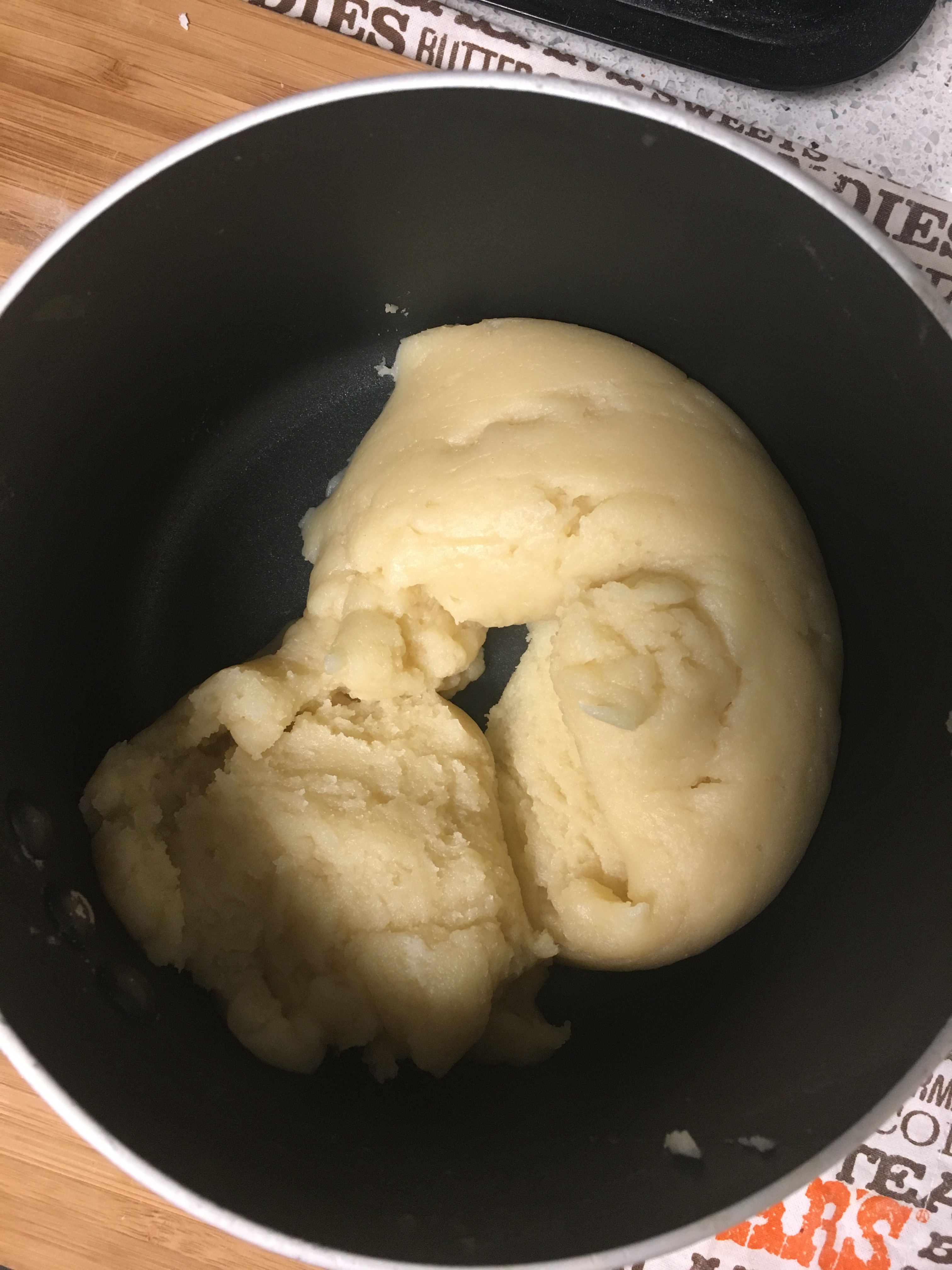- This is what choux pastry should look like when it’s ready in the pan (at this point it’s just flour, water, butter, salt, and sugar)