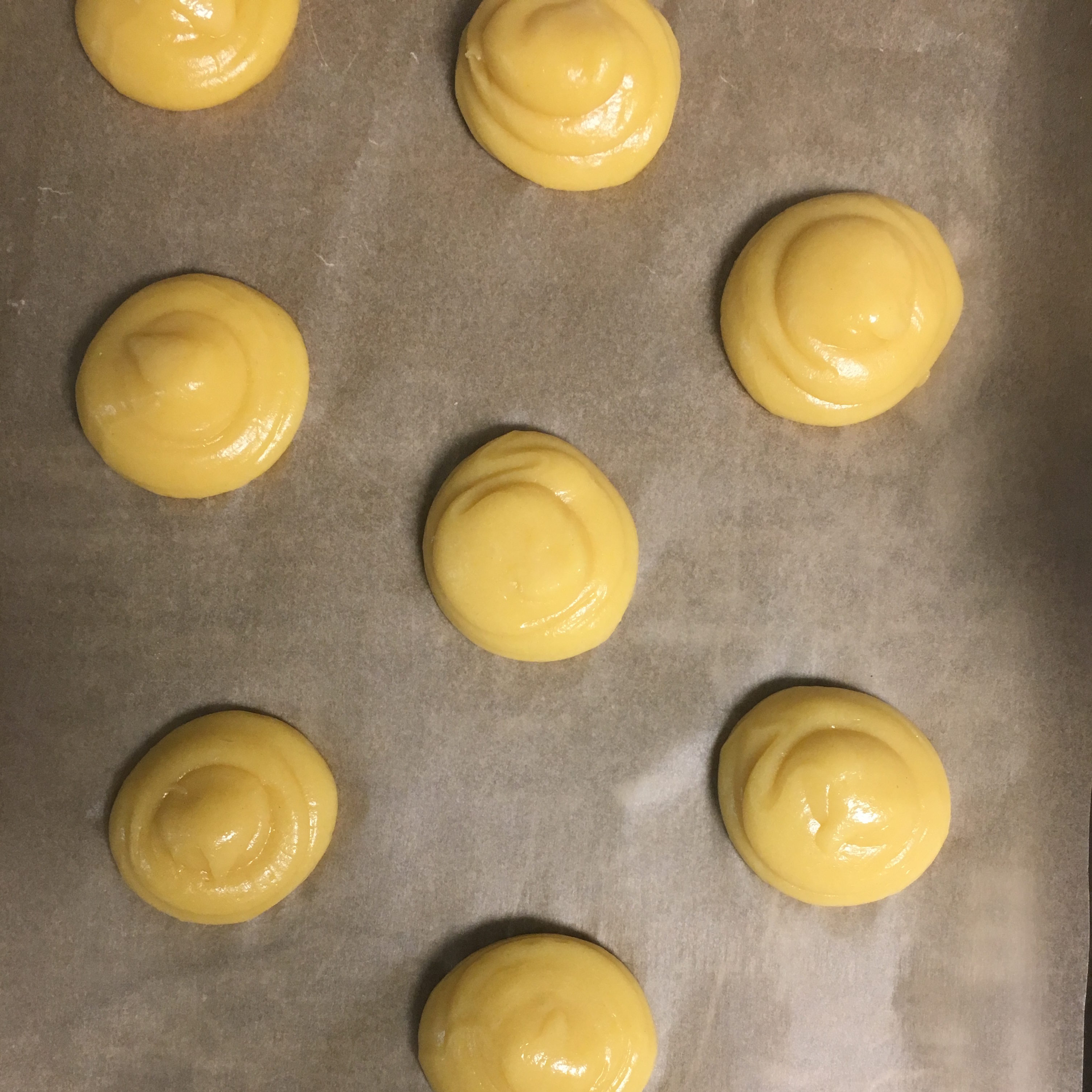 When baking, the cream puffs will puff pretty high up, but not very far out. So you can pipe them about an inch and a half apart and be fine. You want your mounds to be about 1 1/2 inches in diameter. If you get small peaks on the top of your mounds – don’t worry! If you put some water on your finger, you can press down on them lightly to remove them. Once you have piped all of your puffs, brush some egg wash on top of each one. This will help make them shiny when they are taken out of the oven!